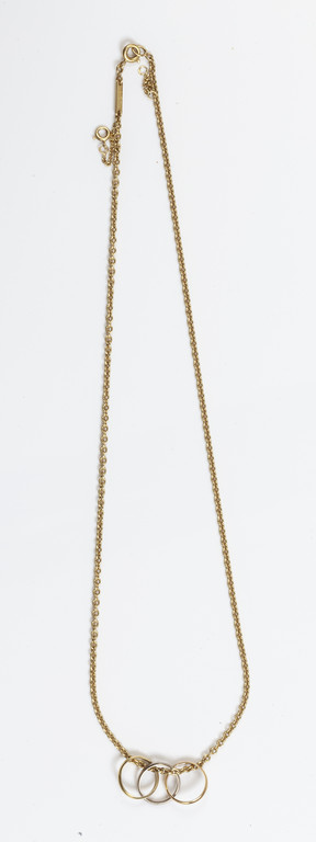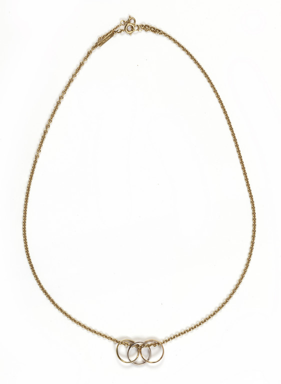 CARTIER Collanina rolò in oro giallo con ciondolo formato da tre anellini con i tre colori dell'oro. firmato e numerato.