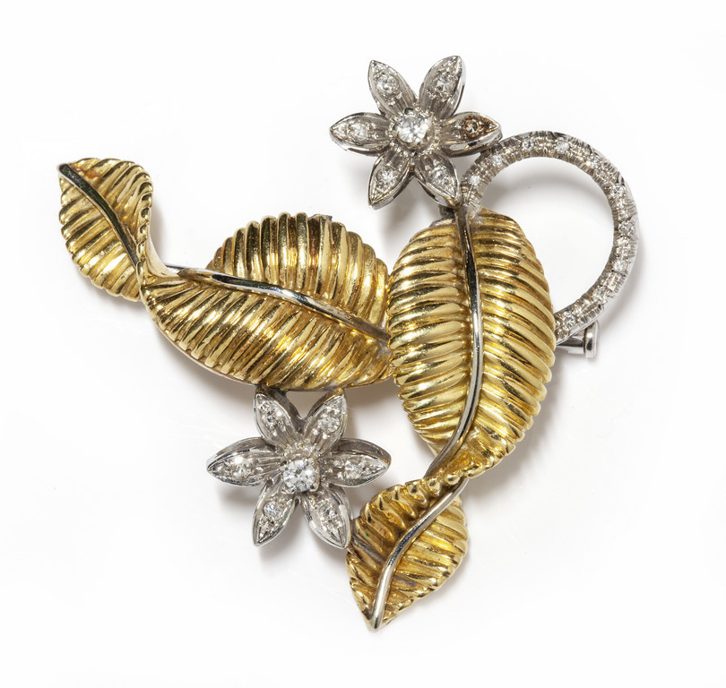 Spilla a motivo floreale in oro giallo e bianco con diamanti.