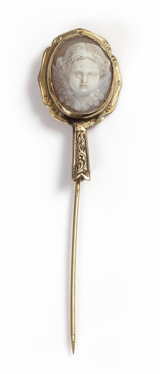 Spilla epoca Liberty in oro rosso con montato altorilievo in conchiglia a forma di testa d'angelo.