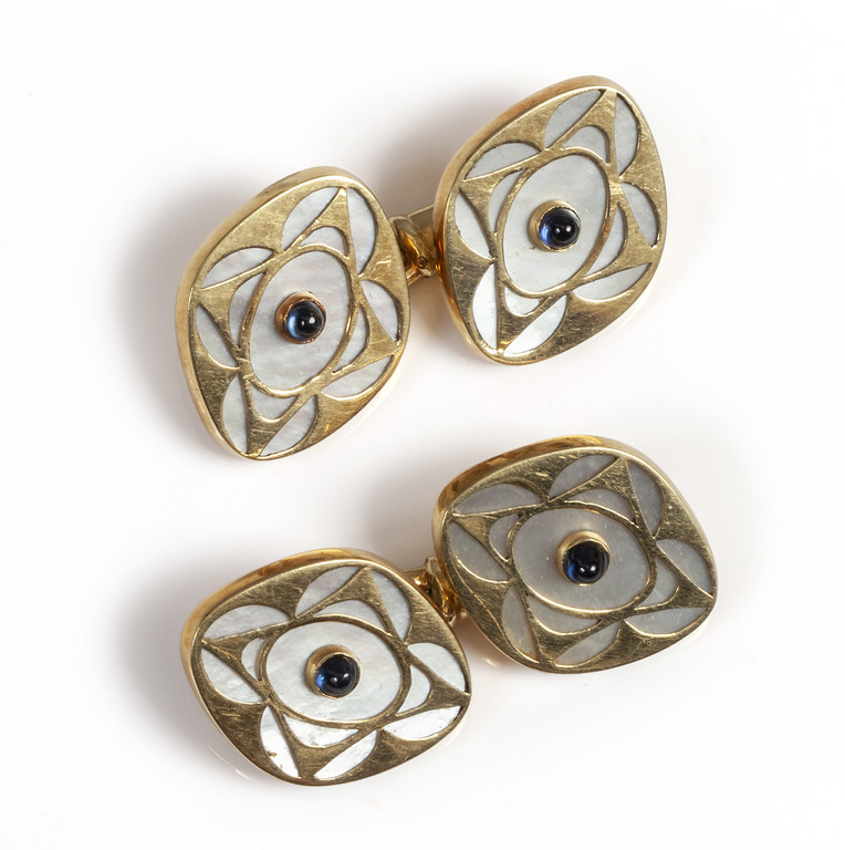 Gemelli in oro giallo e madreperla che per contrasto formano un arabesco nella parte centrale sono incastonati quattro piccoli zaffiri cabochon