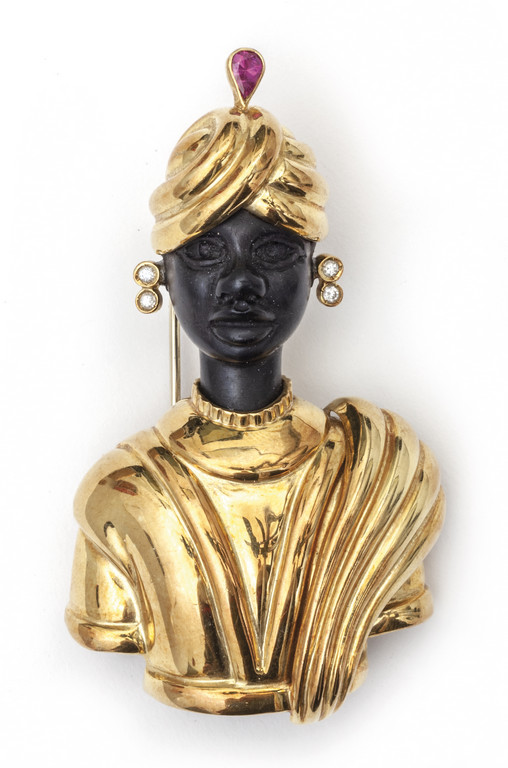 Spilla in oro giallo ed ebano a forma di 'Moretto Veneziano' sul turbante sono incastonati quattro piccoli brillanti ed un rubino taglio goccia