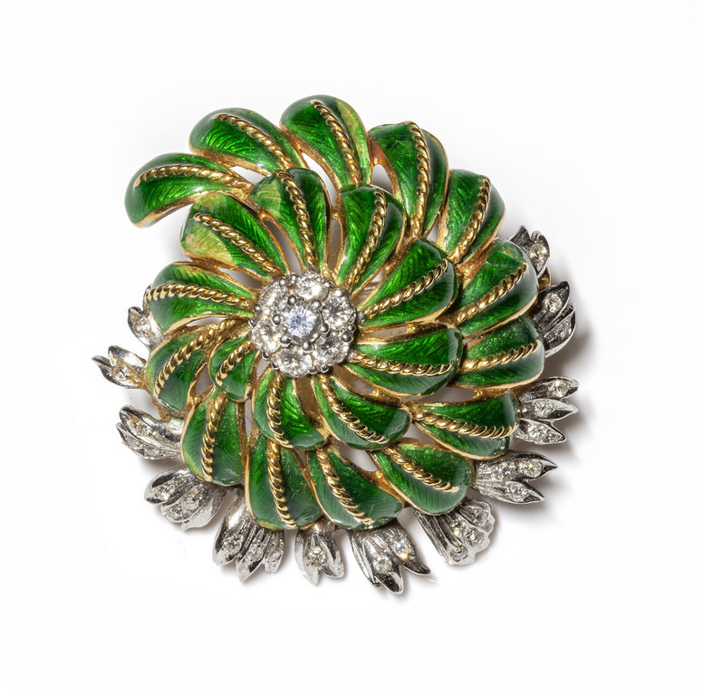 Spilla a spirale con foglie smaltate in verde in oro giallo e bianco e diamanti taglio brillante e 8/8. Punzone del fabbricante 1430 AL