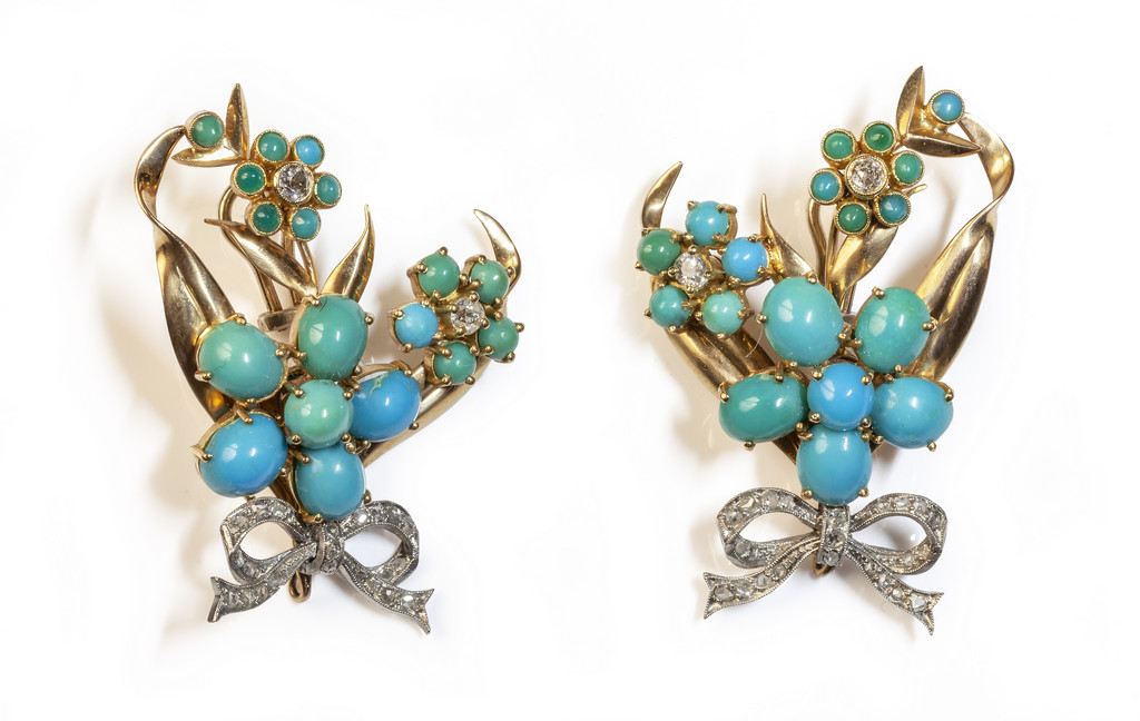 Orecchini a mazzolino di fiori in oro e platino con turchesi e diamanti di taglio antico e taglio a rosa