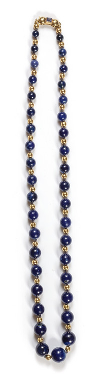 Collana formata da sfere in lapislazzulo di misura degradè da mm 7 a 15 intercalate da sfere e chiusura in oro giallo