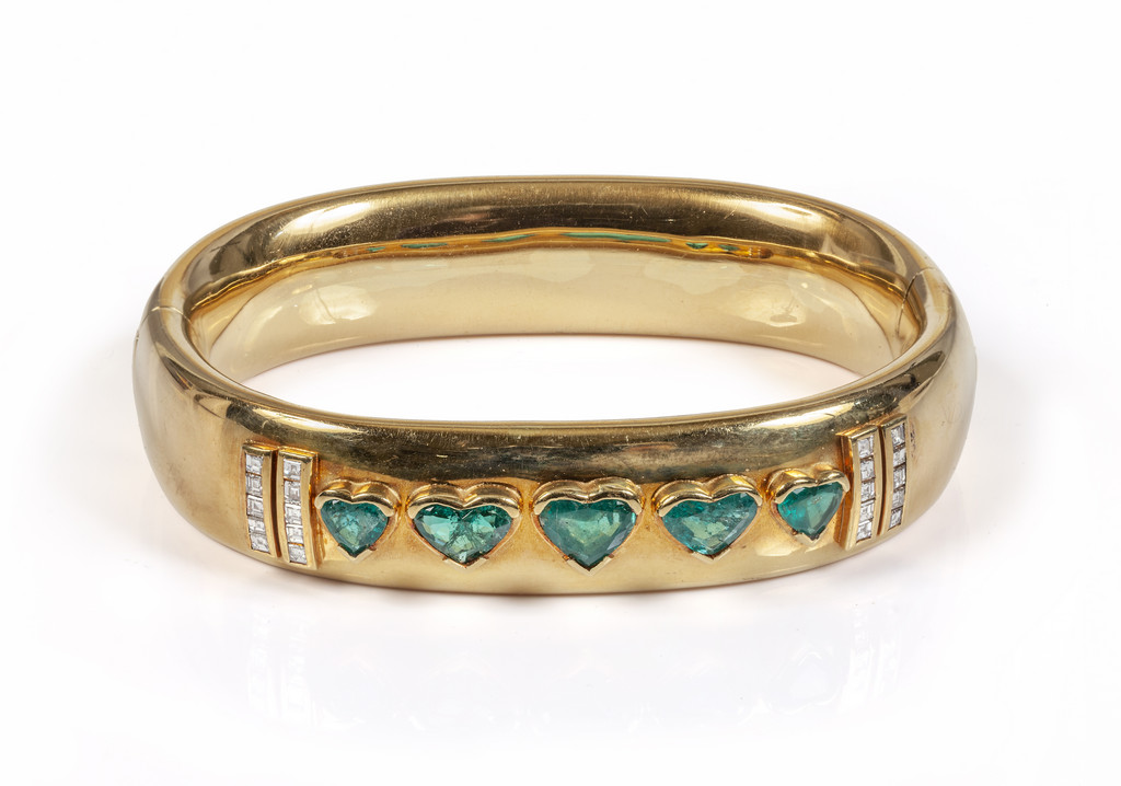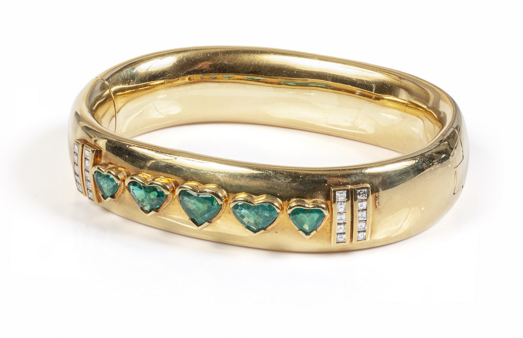 Bracciale rigido in oro giallo con smeraldi di forma a cuore del peso di circa 6 00 ct stimati e diamanti carré