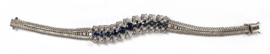 Bracciale in oro bianco con incastonati undici zaffiri naturali di forma rotonda per tot ct 5 00 circa e diamanti taglio brillante e taglio huit-huit per tot ct 0 70 circa