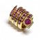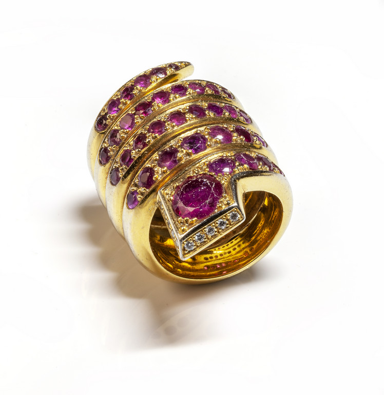 Anello a guisa di serpente in oro giallo con rubini di forma rotonda per circa 3 ct totali e piccoli diamanti.