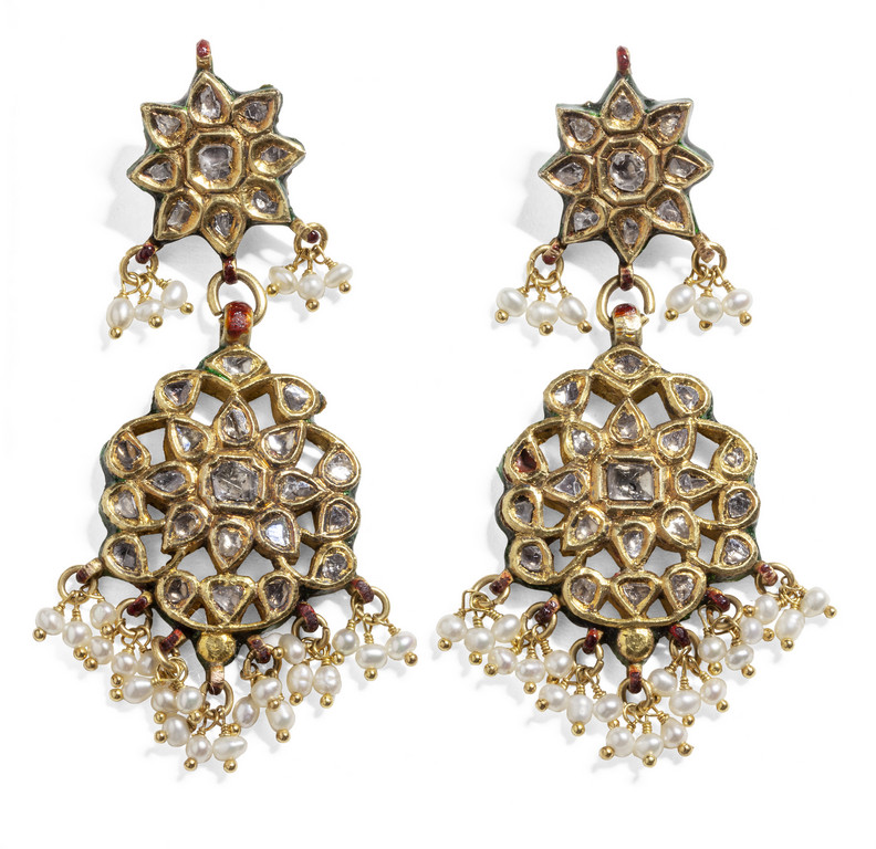 Orecchini in oro a foggia moghul con diamanti a rosa perle e smalti policromi.