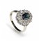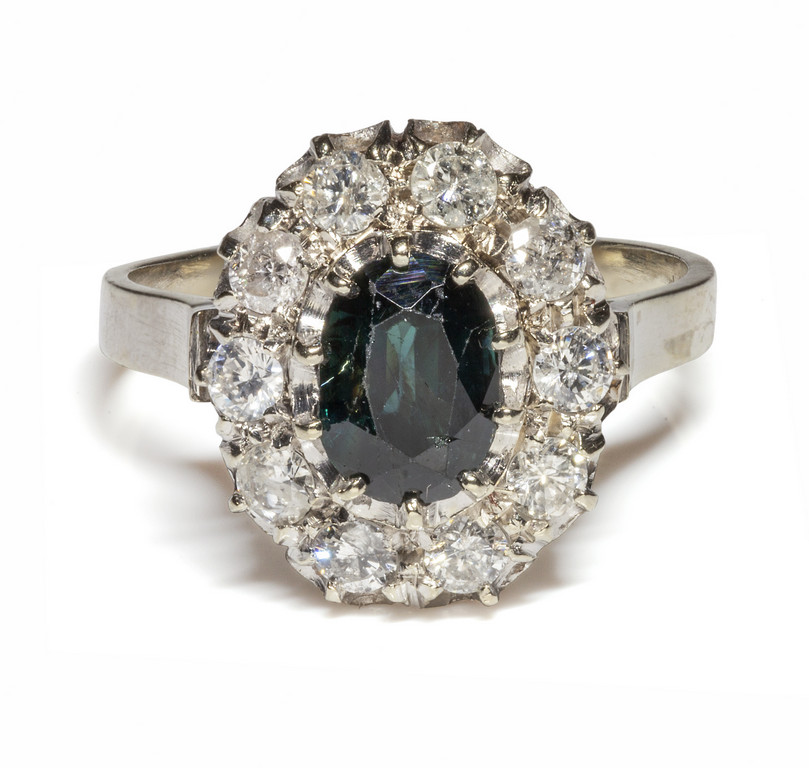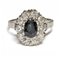 Anello in oro bianco con zaffiro centrale di forma ovale di circa 1 20 ct stimati e diamanti di contorno di forma rotonda taglio a brillante per 0 70 ct