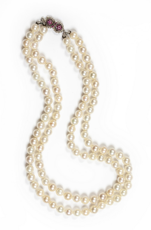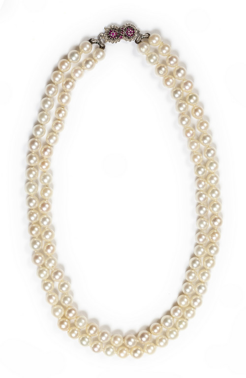 Collana girocollo a due fili di perle coltivate di 7 00 mm di diametro con chiusura in oro bianco e piccoli rubini
