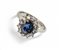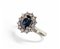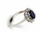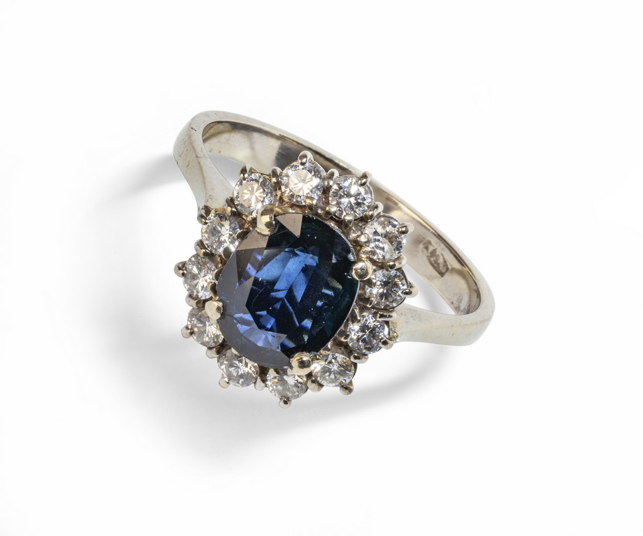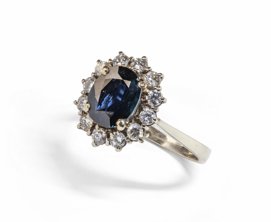 Anello in oro bianco a contorno con diamanti per circa 0 45 ct stimati e zaffiro centrale di circa 2 30 ct stimati.