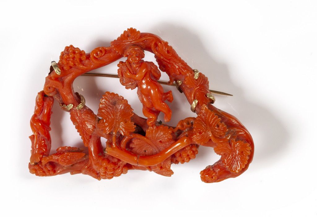 Spilla d'epoca in corallo raffigurante tralcio d'uva e putto con lira