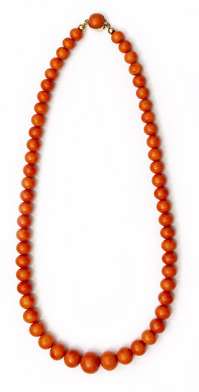 Collana in corallo rosso-aranciato con sfere da mm 9 28 a 15 28 chiusura in oro.
