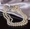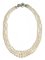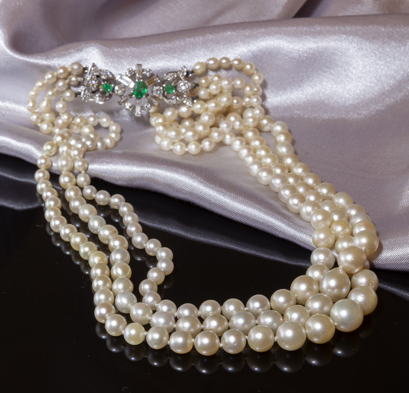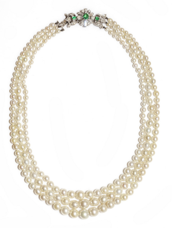 Collana composta da tre fili di perle degradè da mm 9. Chiusura in oro bianco con incastonati smeraldi naturali taglio a goccia e ottagonale per tot ct 0 70 e diamanti naturali taglio brillante e baguette per tot ct 1 20 circa