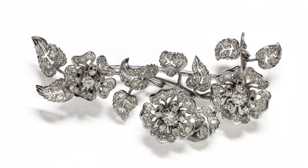 Spilla in oro bianco a tralcio floreale en tremblant con diamanti taglio huit-huit e brillante
