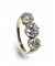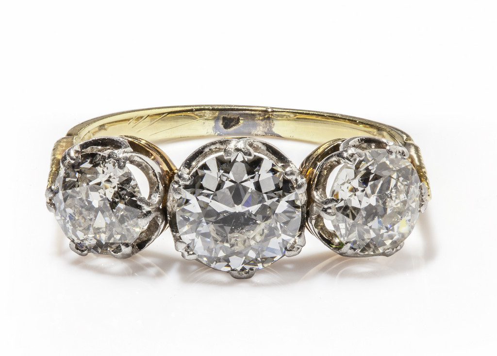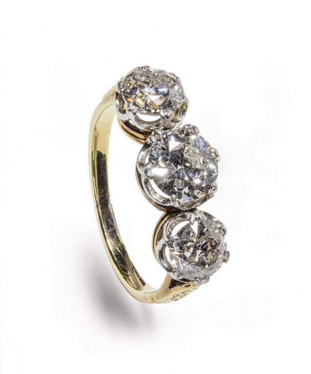 Anello d'epoca trilogy in oro giallo con testa in platino con incassati 3 diamanti di forma rotonda taglio antico del peso complessivo stimato di 1 40 ct.