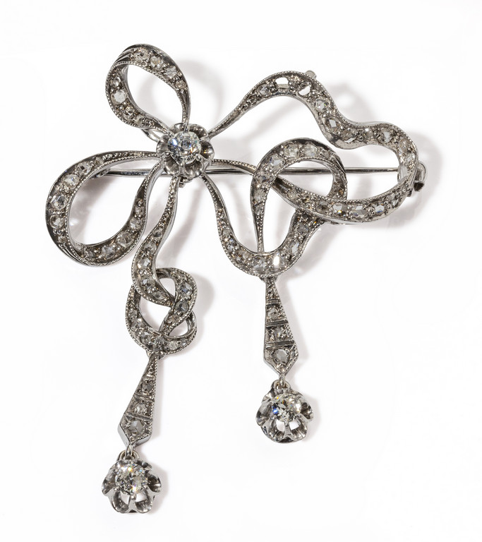 Spilla d'epoca a fiocchetto in platino con diamanti (2 pietre mancanti)