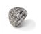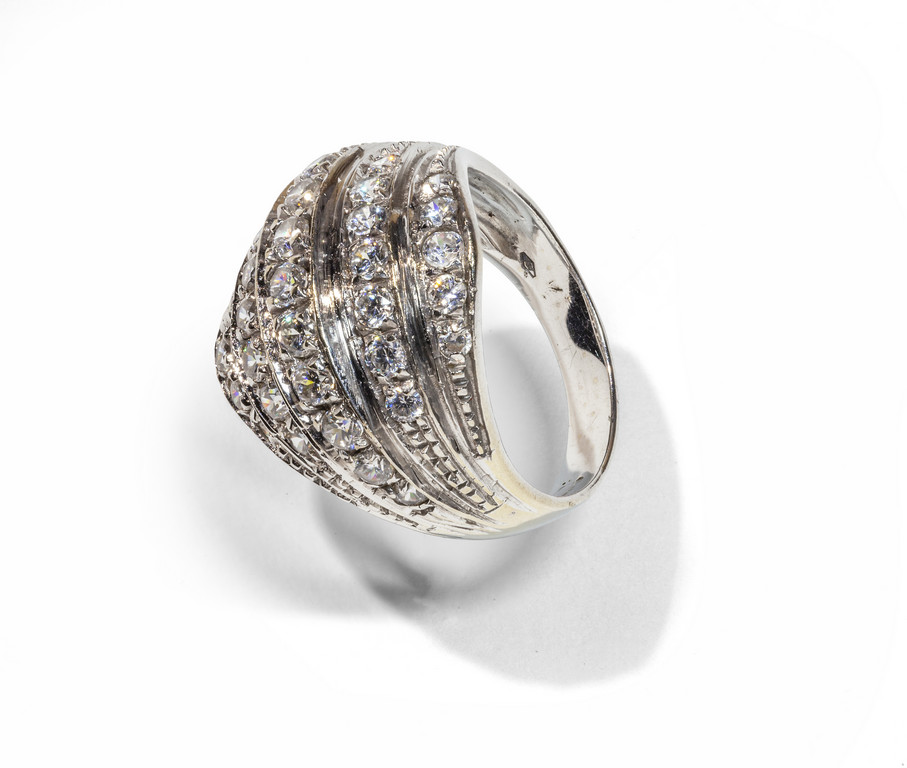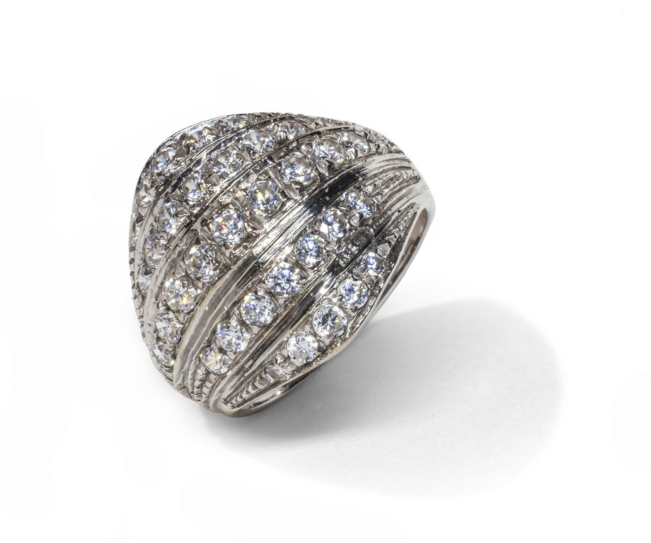 Anello a fascia a spicchi in oro bianco con diamanti.