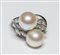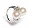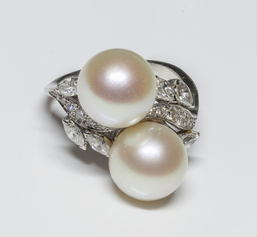 Anello in platino a contrariè con due perle coltivate di acqua salata 10mm di diametro e diamanti.