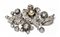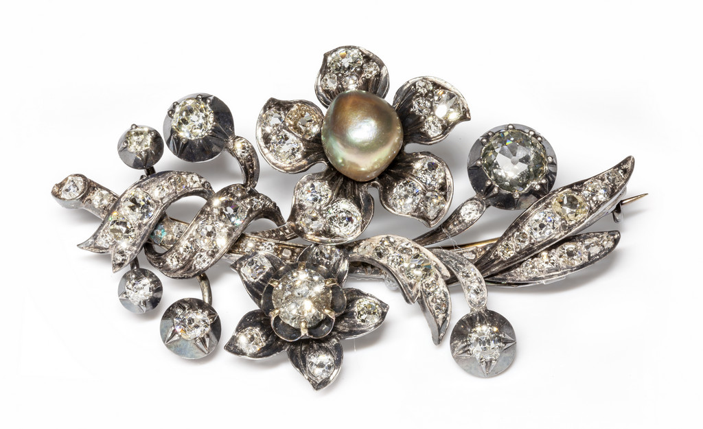 Spilla d'epoca vittoriana in argento e spillone in oro rosso con incastonati diamanti di varia forma e tagli old mine. Perla grigia.