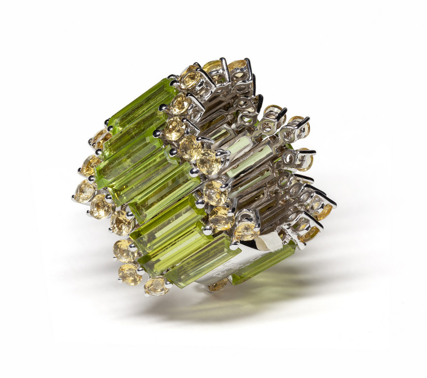 Anello tutto giro in oro bianco immagliato con lunghe baguette di peridoto per 15 65 ct e quarzo citrino di forma rotonda per 3 84 ct.