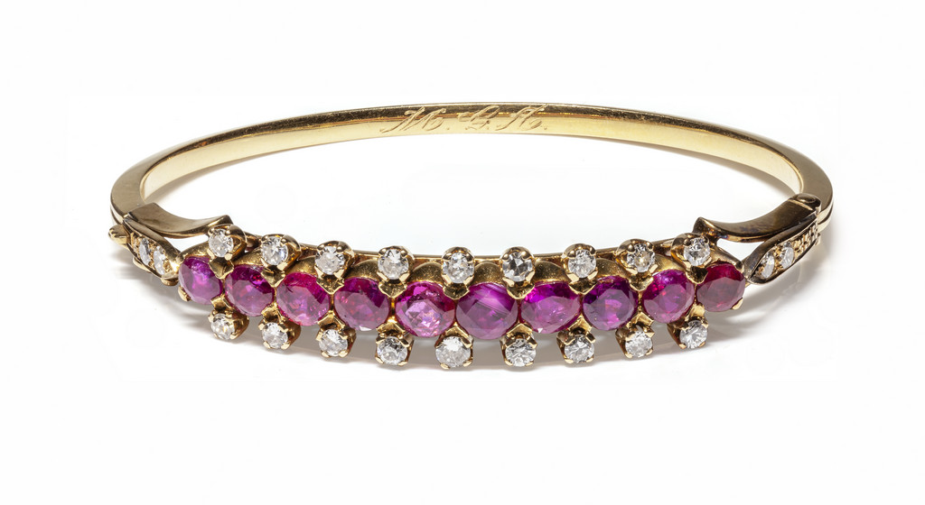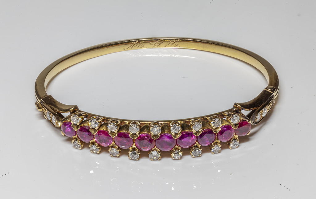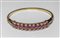 Bracciale d'epoca rigido in oro rosso con al centro 10 rubini di forma rotonda per circa 4 5 ct e 18 diamanti 16/16 per circa 0 90 ct