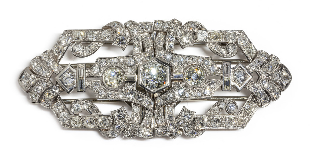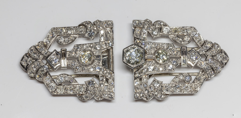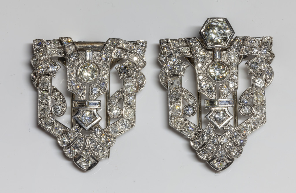 Spilla in platino epoca Art Decò scomponibile in due clips con incastonati nella parte centrale tre diamanti naturali vecchio taglio per tot ct 2 20 e diamanti naturali taglio huit-huit per tot ct 4 80 circa