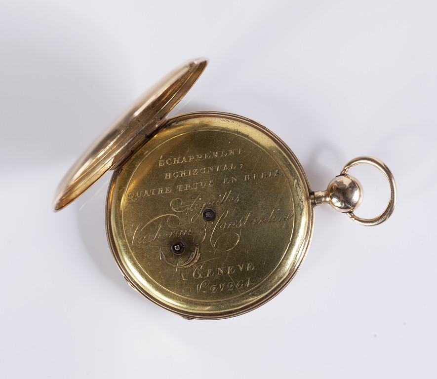 VACHERON CONSTANTIN orologio da tasca cassa in oro rosso suoneria ore e quarti quadrante guilloché al centro piccoli secondi alle tre minuteria a binario numeri romani sfere di minuti a Breguet e quella delle ore a goccia.
