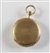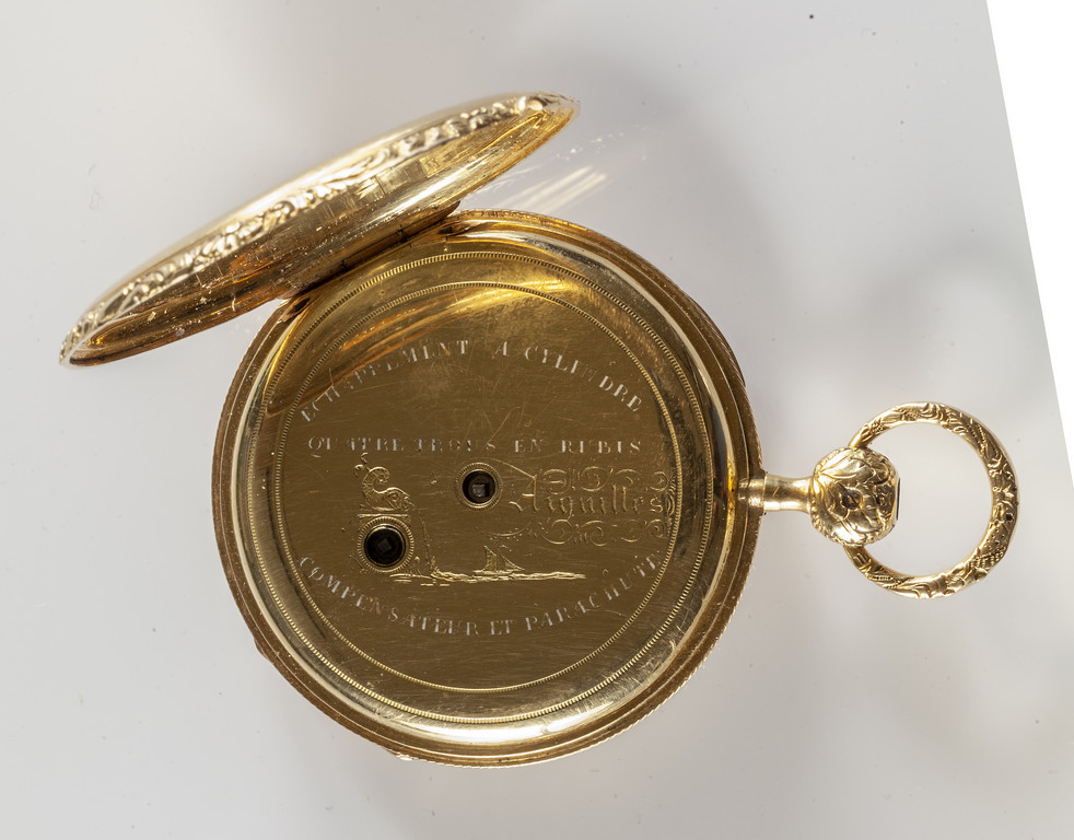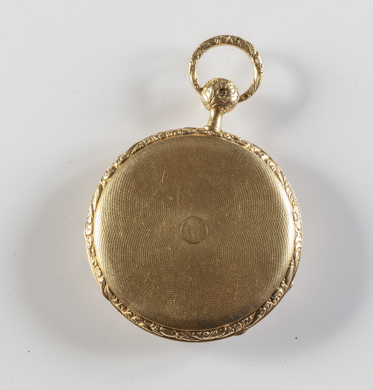 Orologio da tasca carica a chiavetta funzione di suoneria ore e quarti in oro con cassa decorata a fiori quadrante in argento guilloché motivo floreale. Numeri romani smaltati sfere a lancia azzurrate.