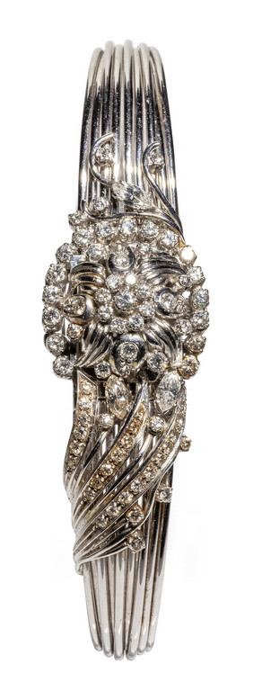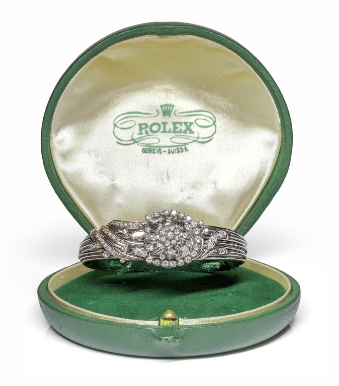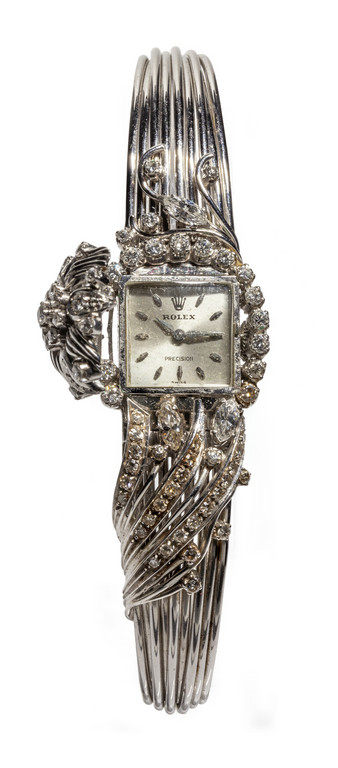ROLEX precision Raro gioiello a bracciale rigido con orologio a mistero. Movimento meccanico a carica manuale in oro bianco con diamanti taglio 8/8 navette e taglio a brillante per un totale di circa 1 60 ct stimati.