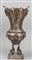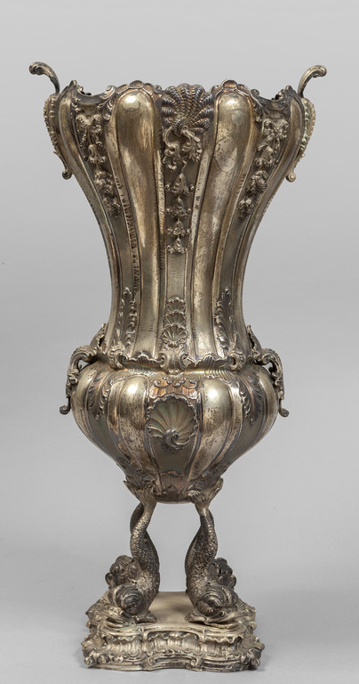 Grande vaso in argento sbalzato sorretto da quattro delfini