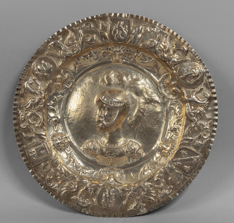 Piatto in argento finemente sbalzato con figura centrale e stemmi araldici