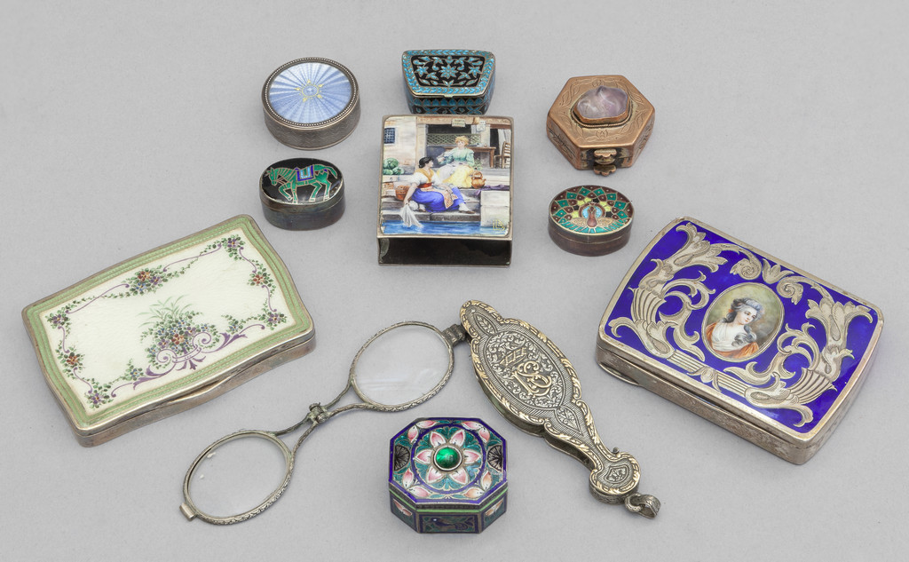 Due tabacchiere in argento e smalto colorato sette portapillole in argento e metallo portafimmiferi in argento smaltato e occhialino da teatro in argento sbalzato e dorato