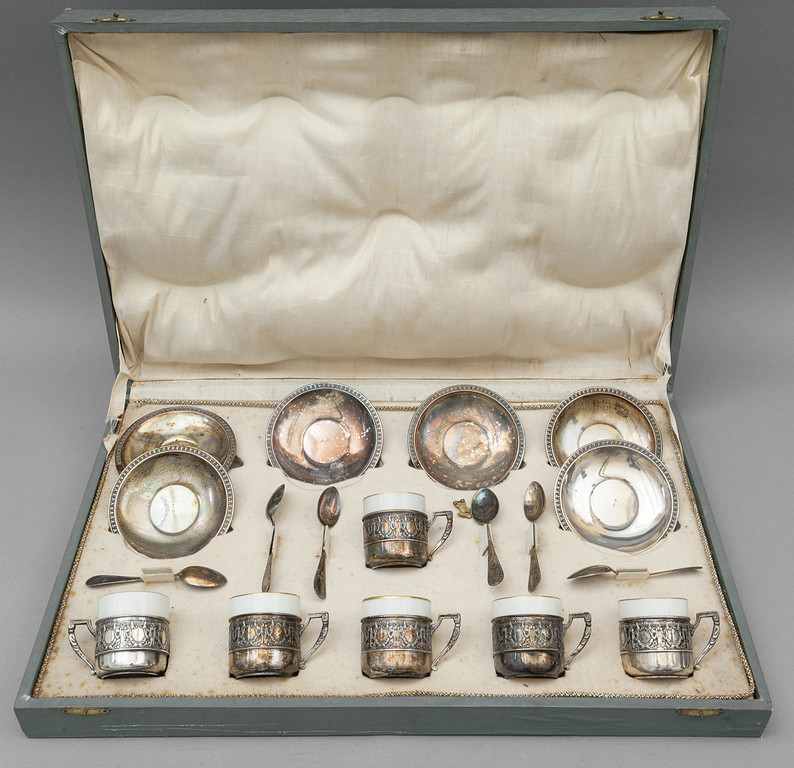 Servizio da caffè Liberty in argento e porcellana Ginori composto da 6 tazzine con piattino e 6 cucchiaini inizi sec.XX