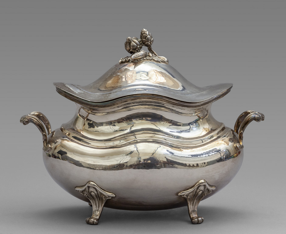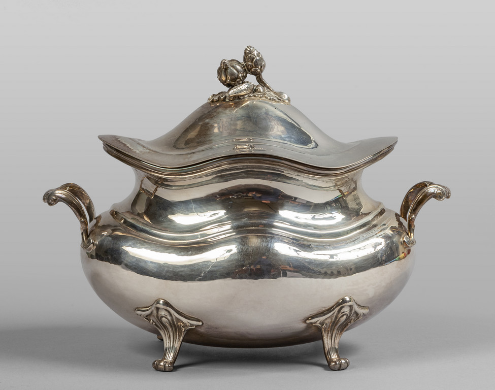 Zuppiera con manici in argento presa con verdura