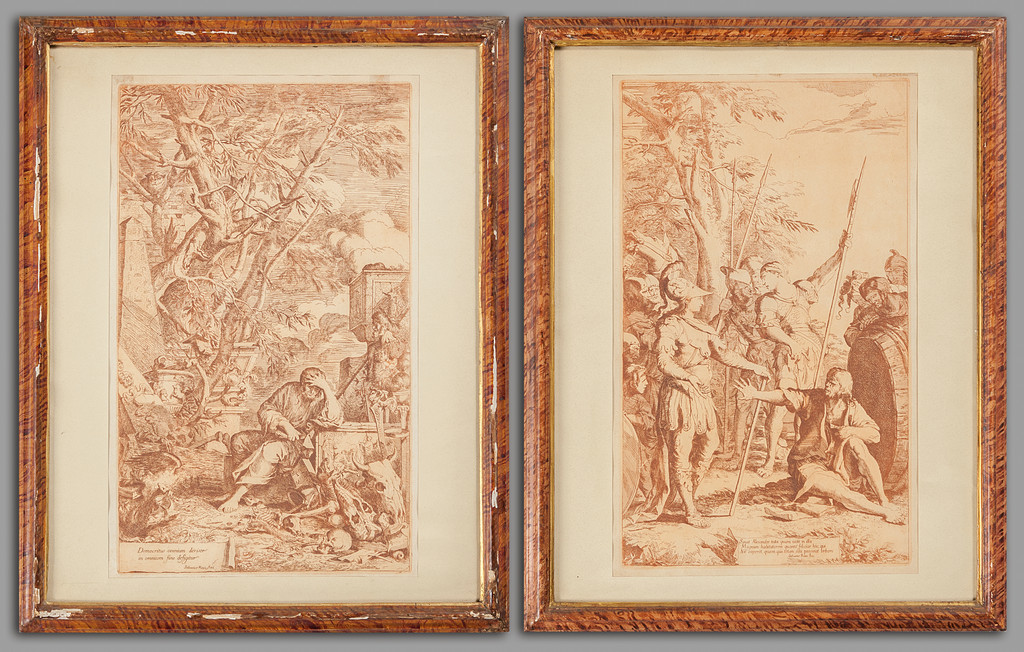 Coppia di stampe a soggetti classici da S.Rosa cornici antiche in legno marmorizzato e dorato