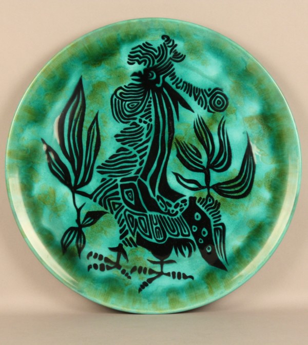 Firmato. LURCAT JEAN - Nato a Bruyères (Lorena, Francia) nel 1892. Morto a Saint-Paul de Vence nel 1966. Grande piatto centrotavola in ceramica verde con tipico decoro ''Le coq noir''. Firma, dessin ''J. LURCAT SANT VICENS 33B''. Anno 1950 circa. Con autentica di Franco Borga. Mis. Diam. cm. 39 ca.