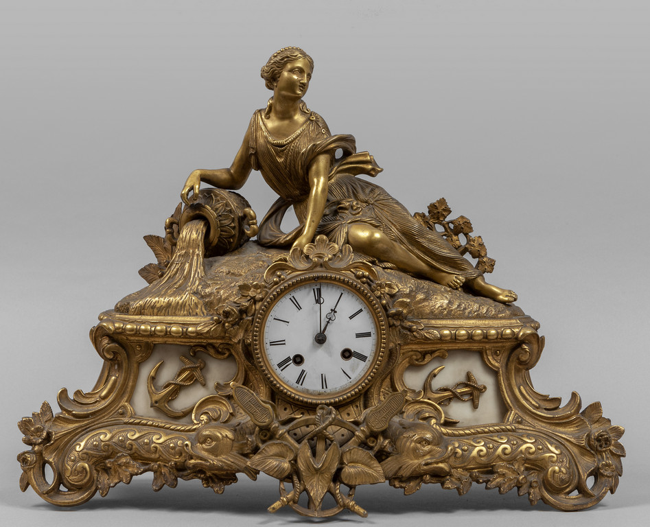 Orologio in bronzo dorato sormontato da figura femminile placche in alabastro sec.XIX