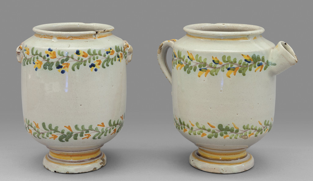 Vaso e versatoio in maiolica decoro a tralci gialli e verdi alla base bollino Antichità Rossi Torino sec.XVIII
