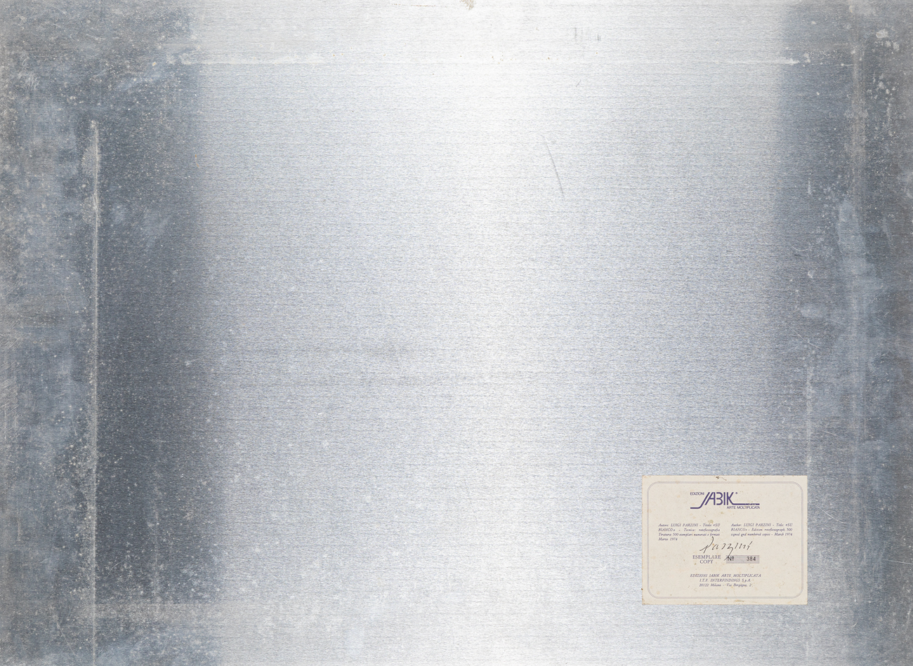 Etichetta delle Edizioni Jabik (MI) al retro con firma e numerazione (Esemplare 384/500) al retro