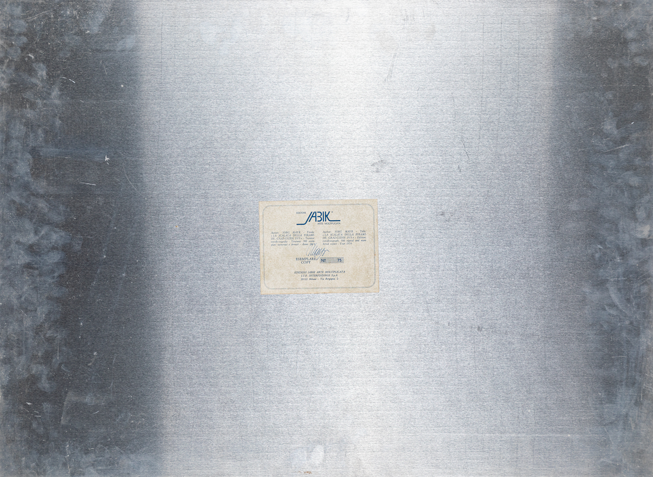Etichetta delle Edizioni Jabik (MI) al retro con firma e numerazione (Esemplare 75/500) al retro