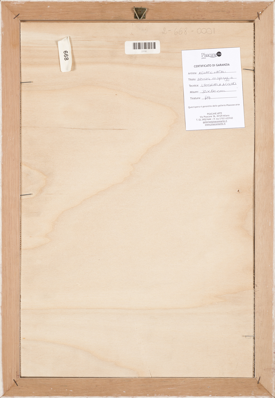 Etichetta della Galleria d'Arte Pisacane (MI) al retro del cartone protettivo