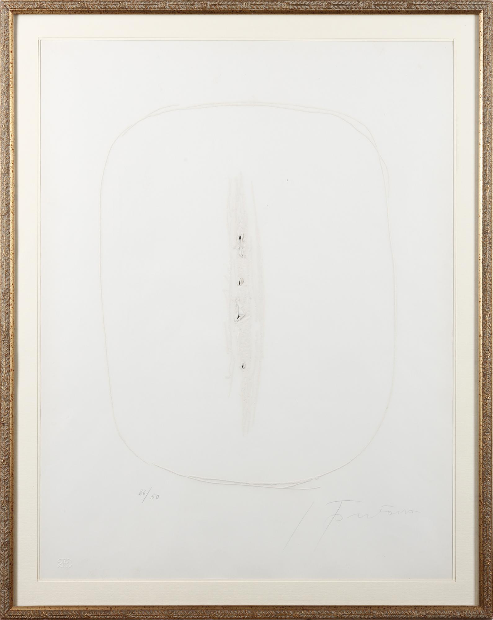 26/50. Tiratura e firma in basso a matita. Timbro a secco 2Rc in basso a sinistra. Edizione totale: 50 esemplari + 11 H.c. Edizioni: 2 Rc e Galleria Marlborough, Roma. Pubblicazione: Lucio Fontana graphics, multiples and more...a cura di Harry Ruhé e Camillo Rigo, Tuja Books, 2006, p.41.
