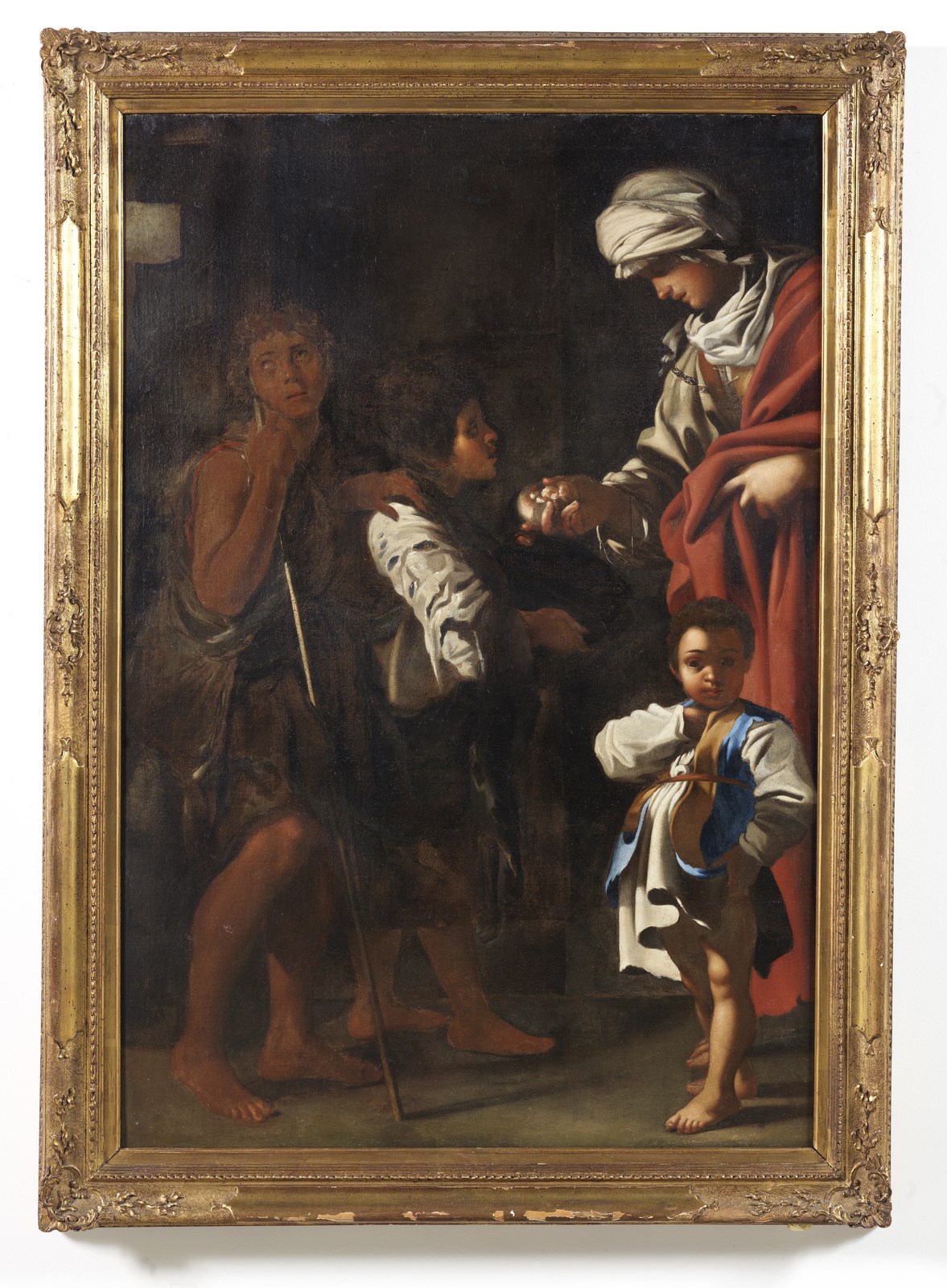 ARTISTA DEL XVII SECOLO Elemosina di Santa Elisabetta d'Ungheria. . Olio su tela . Cm 97,00 x 138,00. . Cornice presente