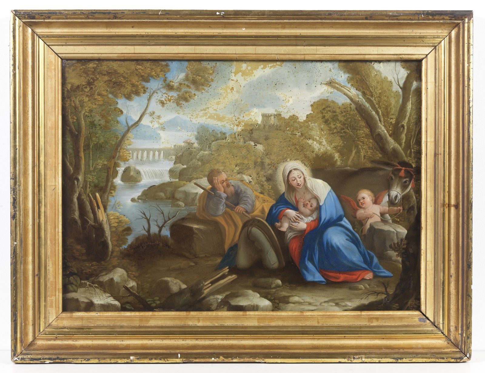 ARTISTA DEL XVII SECOLO Fuga in Egitto. Olio su vetro. Cm 41,00 x 56,50. . Cornice presente