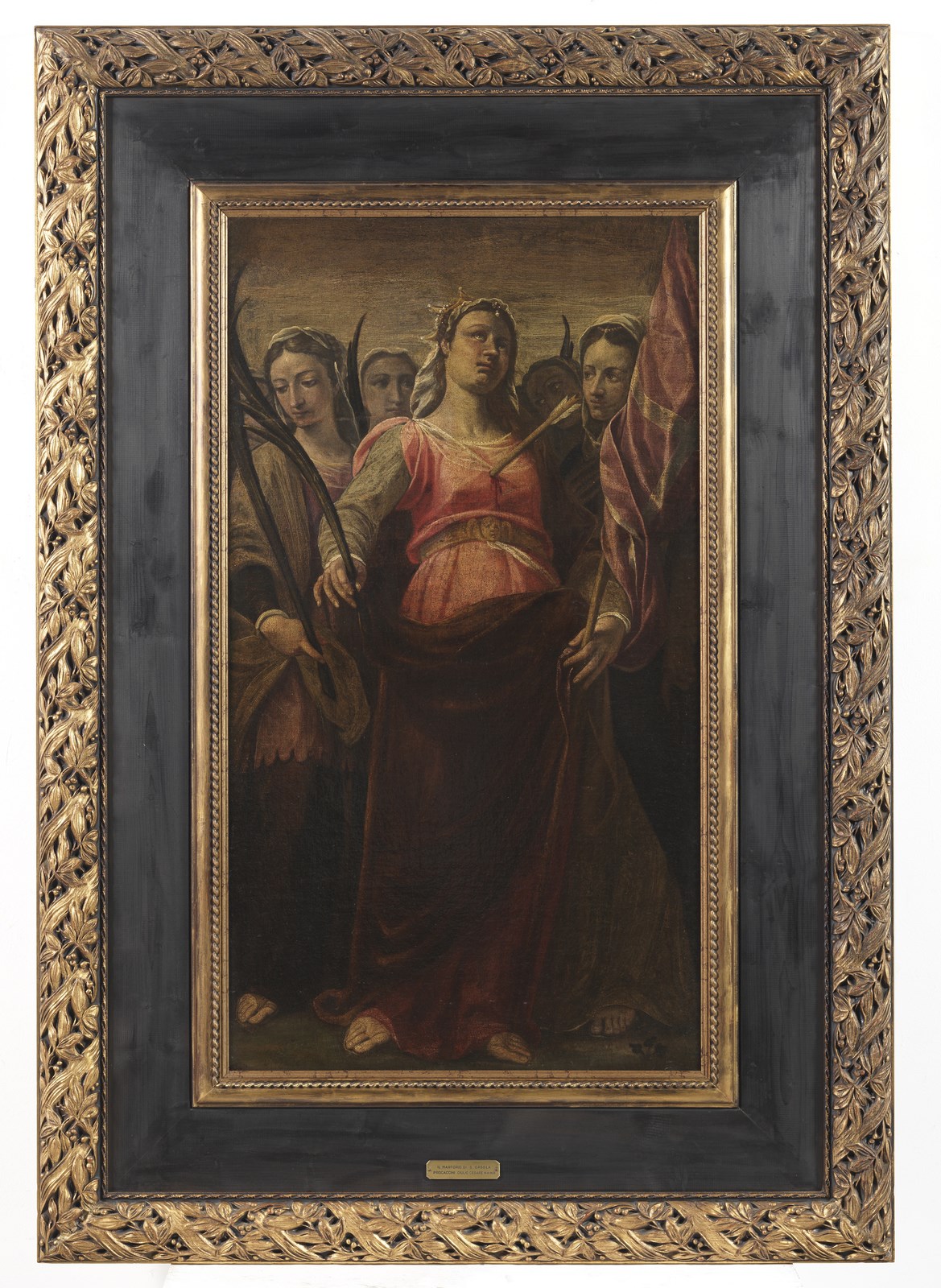 ARTISTA DEL XVII SECOLO Il martirio di Sant'Orsola. Olio su tela . Cm 63,50 x 112,50. . Cornice presente