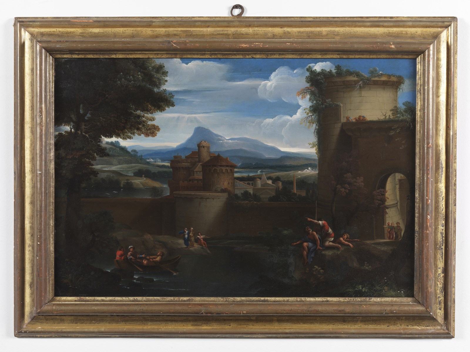 ARTISTA STRANIERO OPERANTE A ROMA NEL XVII SECOLO - Paesaggio fluviale con personaggi. .