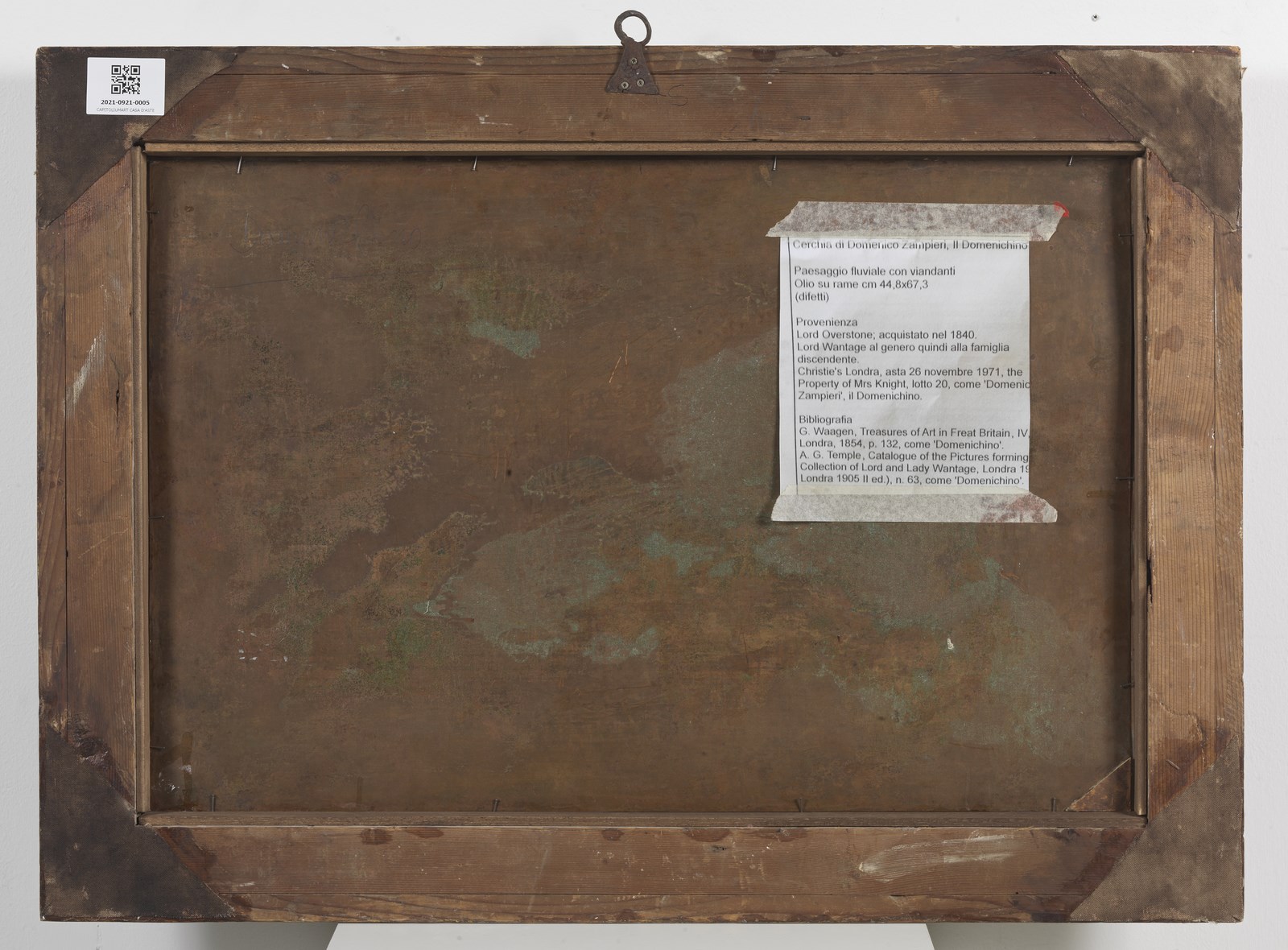 ARTISTA STRANIERO OPERANTE A ROMA NEL XVII SECOLO Paesaggio fluviale con personaggi. . Olio su rame. Cm 68,50 x 44,50. . Cornice presente