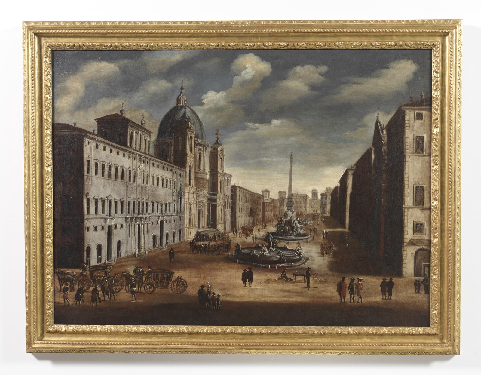 ARTISTA ROMANO DEL XVII SECOLO Veduta di Piazza Navona. Olio su tela . Cm 134,00 x 97,00. . Cornice presente