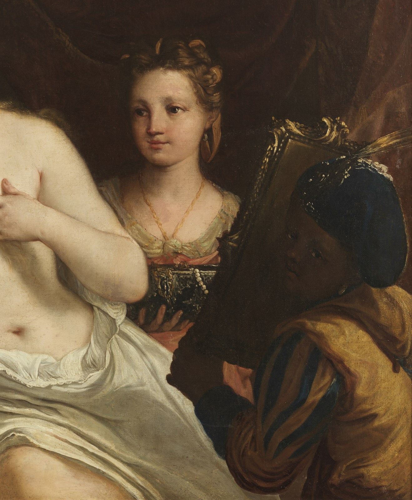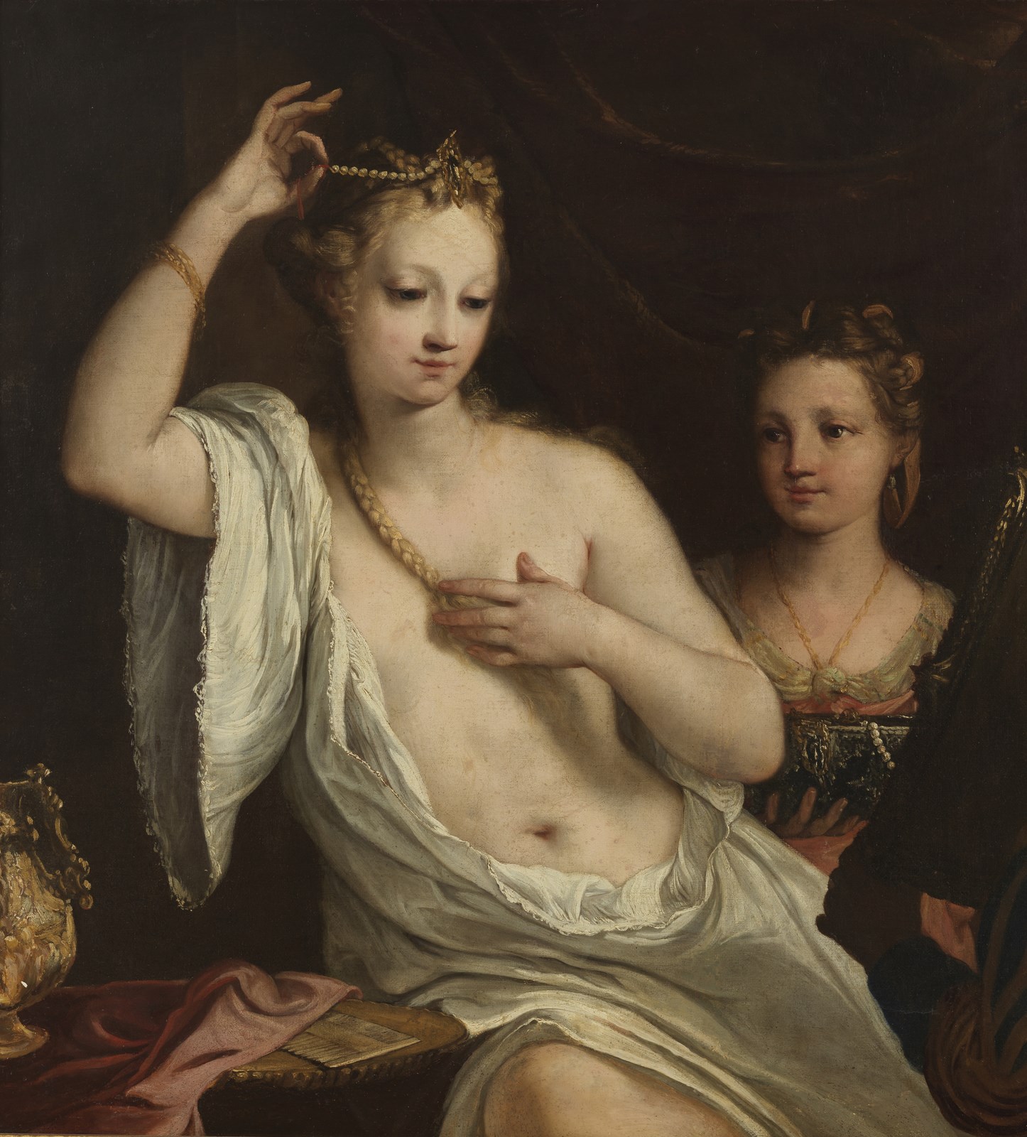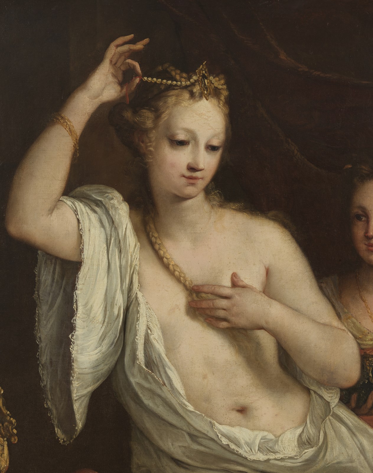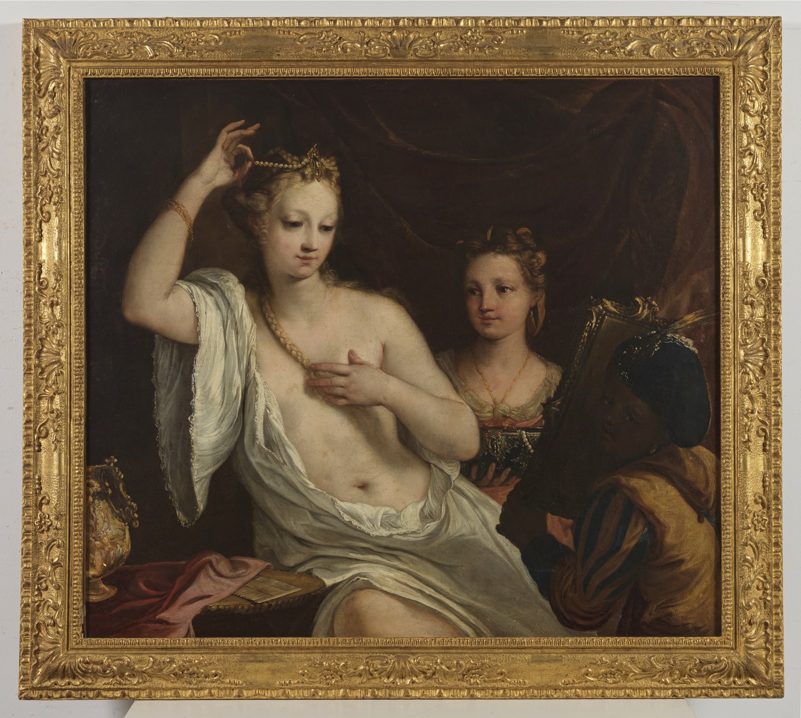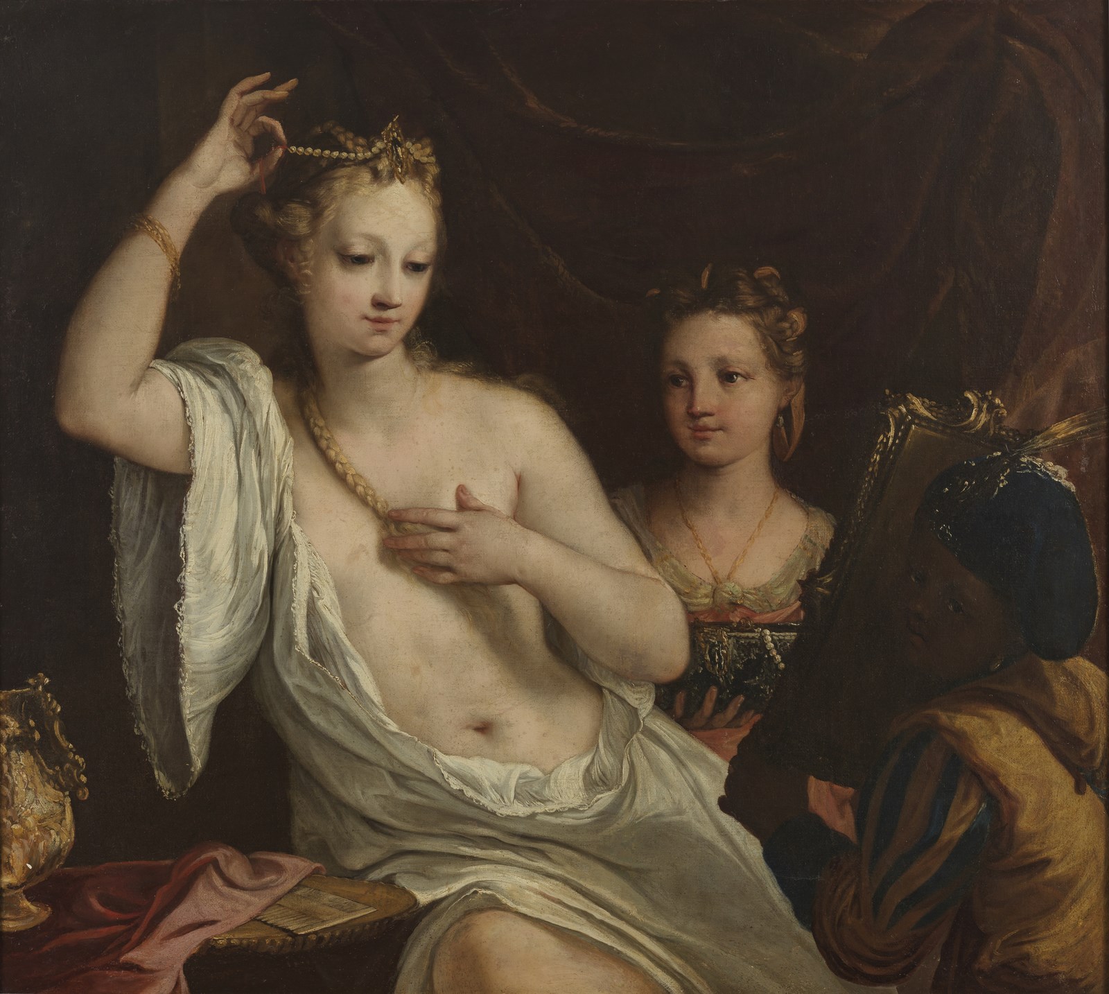 Un'affascinante giovane donna sta legando un filo di perle alla sua elaborata acconciatura, mentre con l'altra mano tiene una treccia di capelli biondi sul petto nudo: appare come da poco uscita dal letto, di cui si vedono forse i tendaggi sullo sfondo, ed è maliziosamente discinta, con una veste candida aperta a mostrare il morbido fianco e l'ombelico. Il lieve sorriso con cui si osserva con piacere allo specchio retto da un paggio di colore, che invece ci rivolge lo sguardo, fa il paio con l'espressione complice e ammirata della servetta che regge un cofanetto di gioie. A sinistra in basso, su un tavolino circolare, sono appoggiati un vaso decorato e un pettine coperto da un drappo rosso.